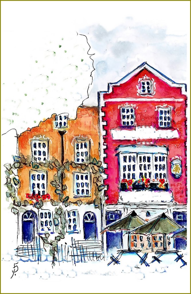 Chicago artist Sylvia Pavlova created a pair of watercolors, showing a pair of quaint shops in Ferkelburg’s business district and a comfy cottage sitting room. Wouldn’t you love to rest on that sofa with a hot cup of tea?
