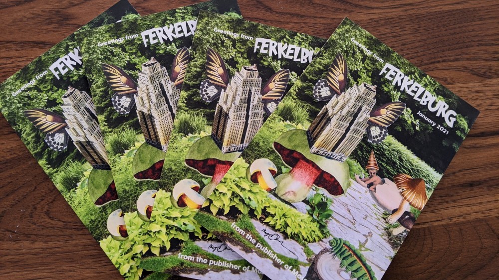 The Krazines are just getting started with stories and pictures from Ferkelburg. In the first half of 2021, they’ll produce postcards and share them with subscribers to their publication, offer a special edition issue, titled Ferkelburg in Black-and-White, which will feature a story by Jodi Diderrich (excerpted in the January 2021 issue), as well as art, prose and poetry by other contributors.