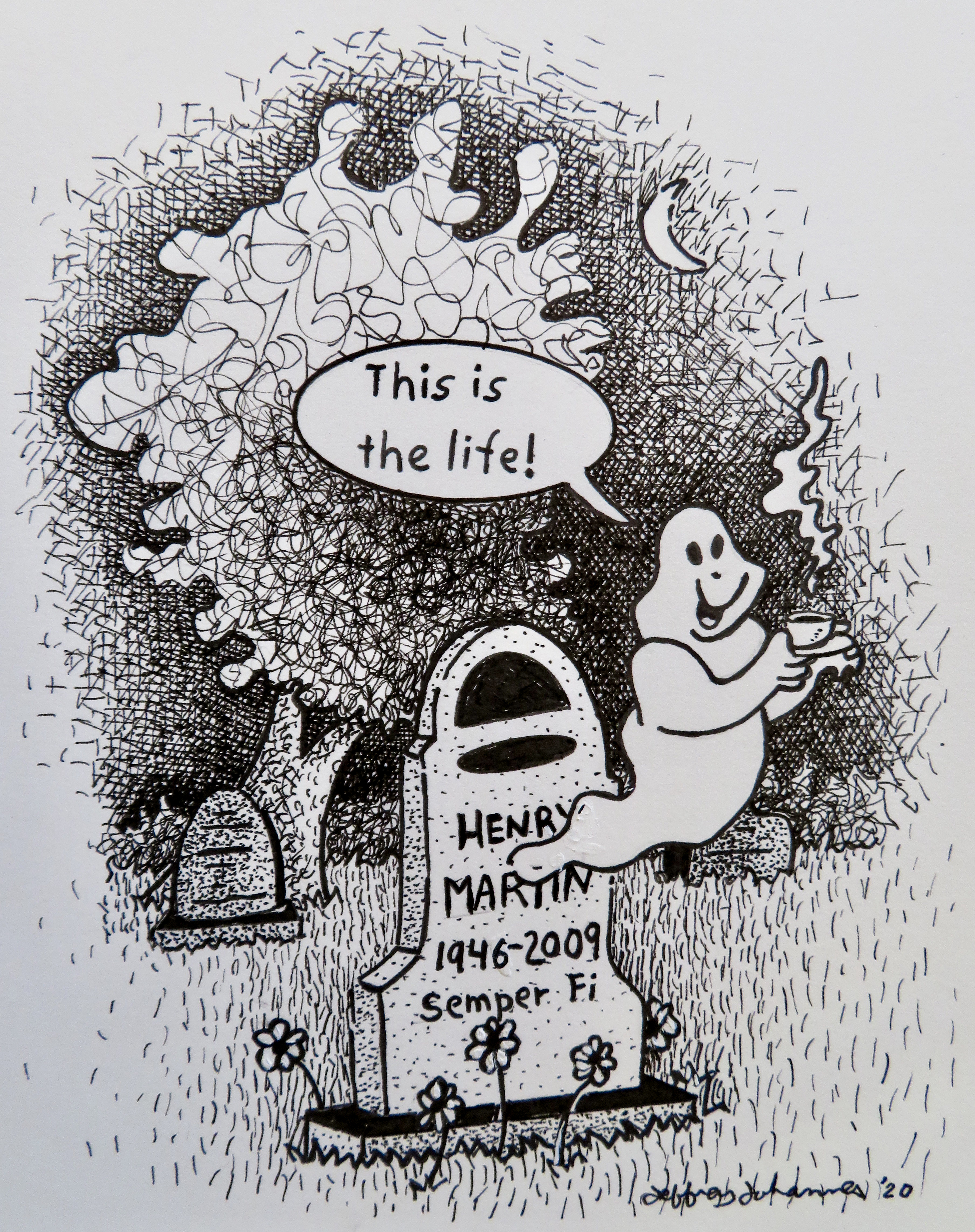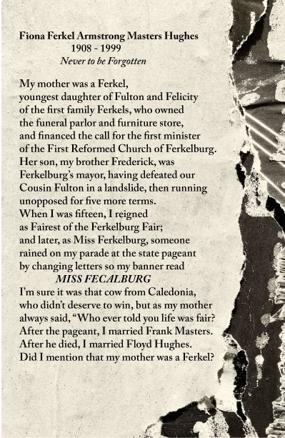 I was amazed by the variety and quality of the interpretations from the 19 artists and authors who took on the challenge. Joan Wiese Johannes of Port Edwards, WI, inspired by Edgar Lee Masters’ Spoon River Anthology, crafted several free-verse epitaphs for the Ferkelburg residents, including Fiona Ferkel Armstrong Masters Hughes, who’d gone to their final rest in the town’s cemetery, while her husband, Jeffrey (first row), and I (second row) contributed artwork. The bespectacled gal at bottom left is a portrait of Fiona. At bottom right is Dorothy Brown and her companion, Potato Chip.