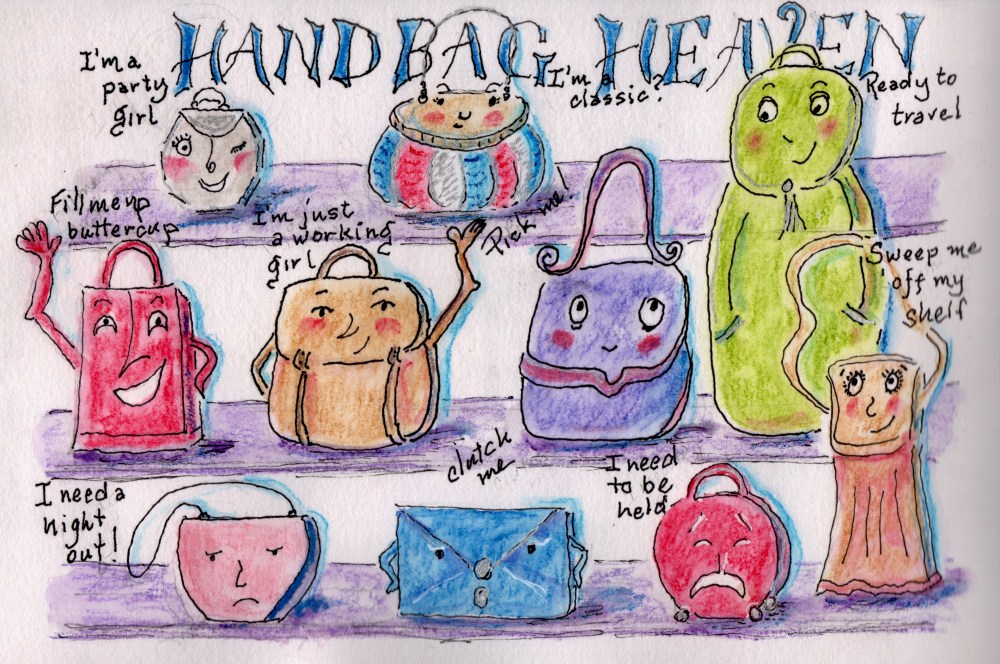 Scappoose, OR artist Linda D’Amario window-shopped in Ferkelburg until she found Heavenly Handbag Boutique, where she sketched some of the accessories there, and her husband, Dan, wrote a poem about the place. Click HERE for a digital version of our Greetings from Ferkelburg issue and turn to page 18 to read Dan’s piece.