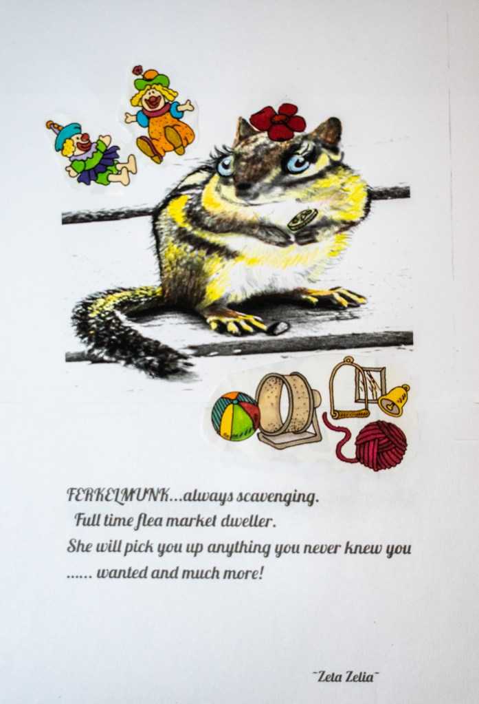 Several contributors used collage to show different environments. Racine artist Terry Evans presented a worldview and populated it with Wonder Woman and her ensemble of creatives: The Muses of Mirth. Fellow Racine artist Jon C. Bolton shared a picture of the local swimming hole in his piece, “Soup Tsunami.” Kenosha artist Zelia Zeta assembled images of one of Ferkelburg’s woodland creatures, the Ferkelmunk, with a couple of giddy souls and some trinkets from the local flea market.
