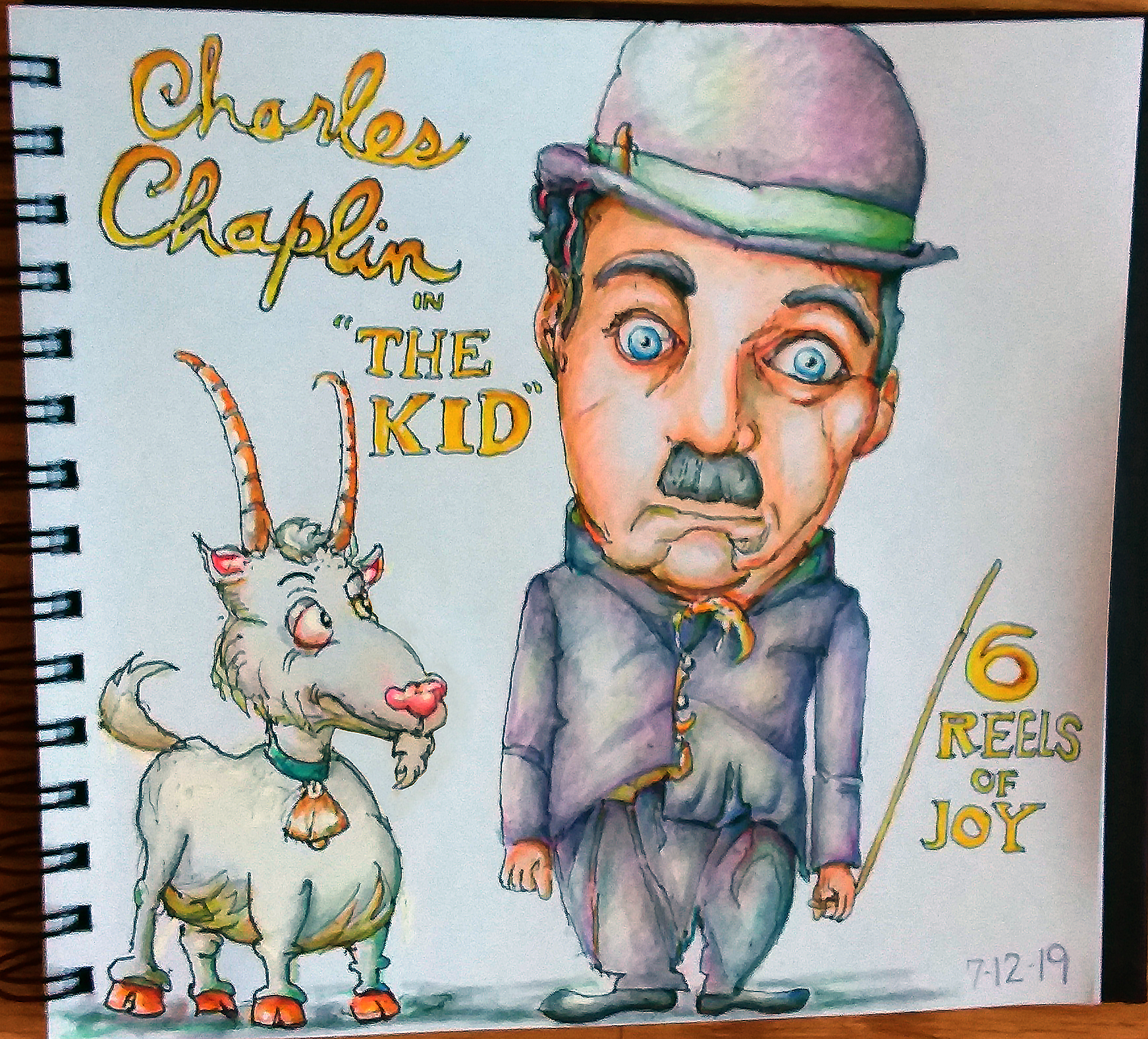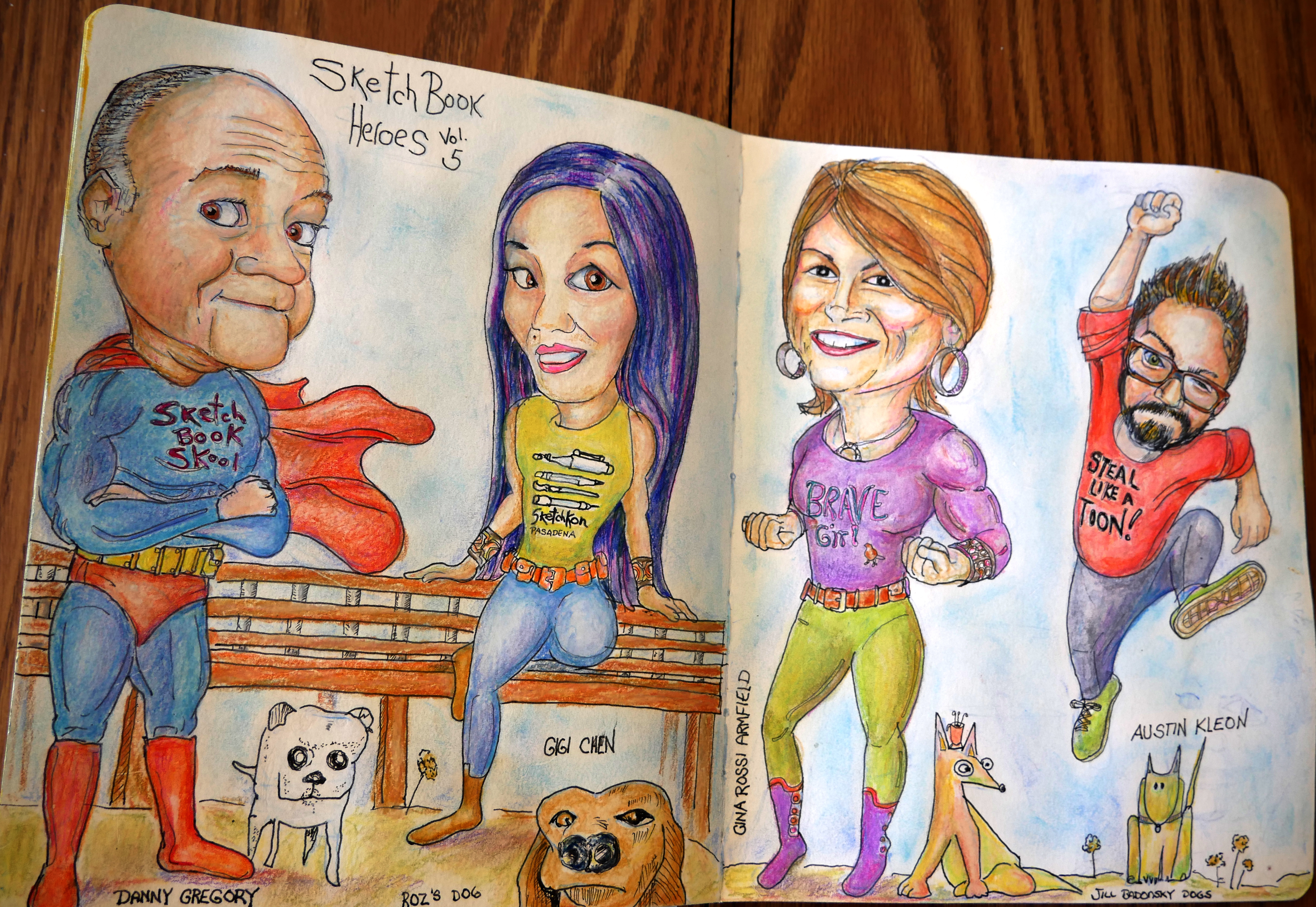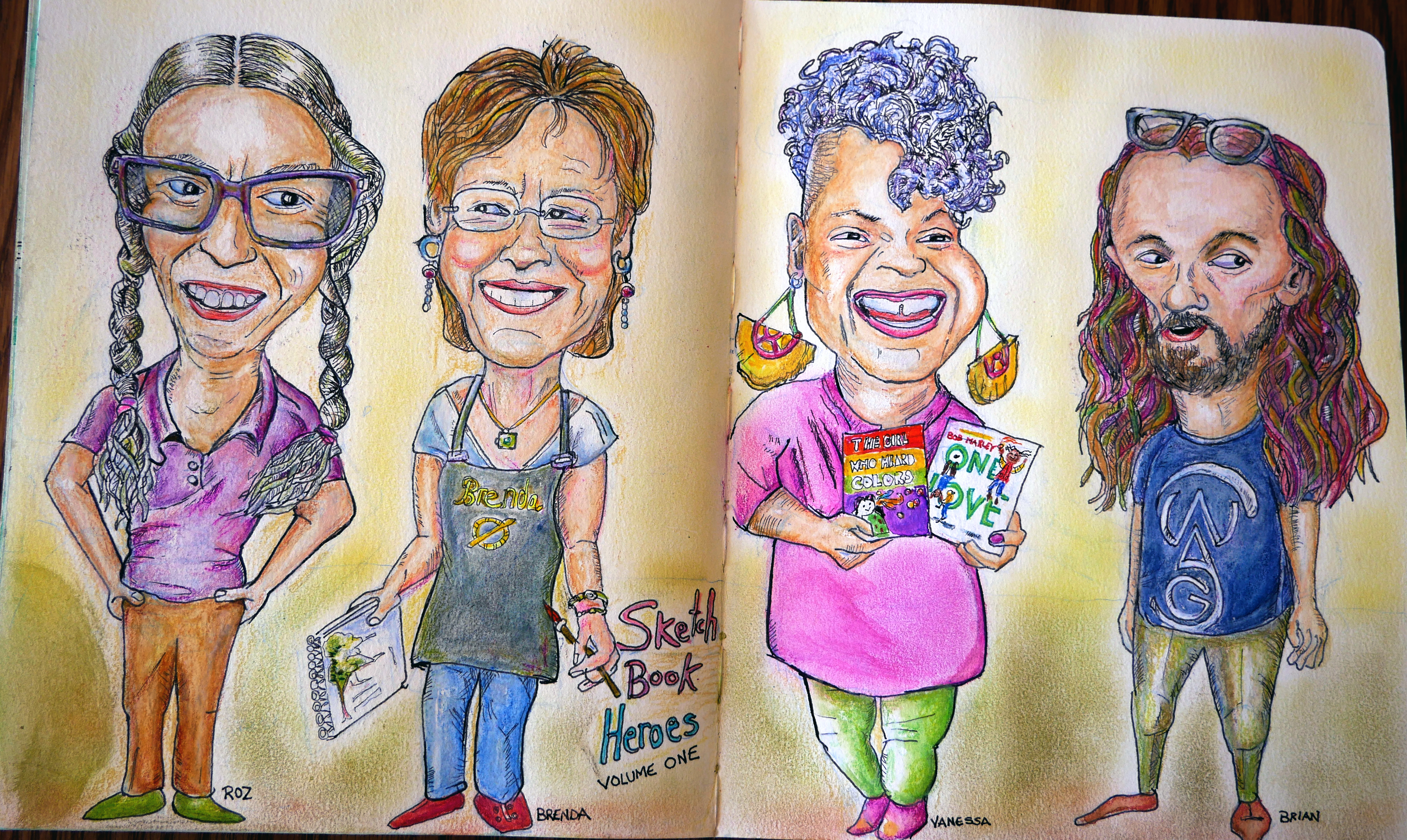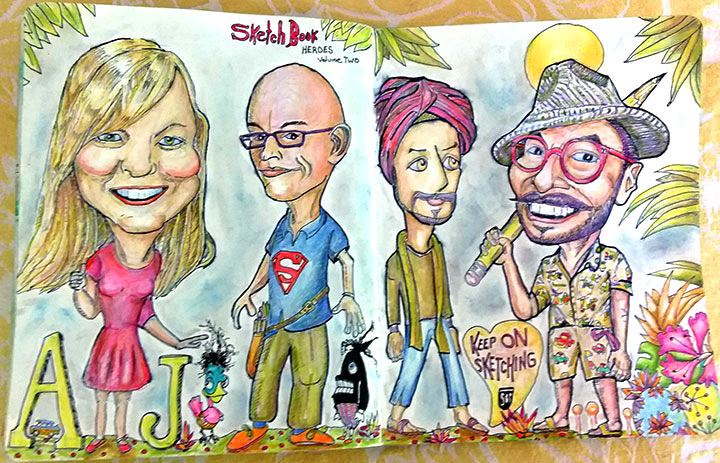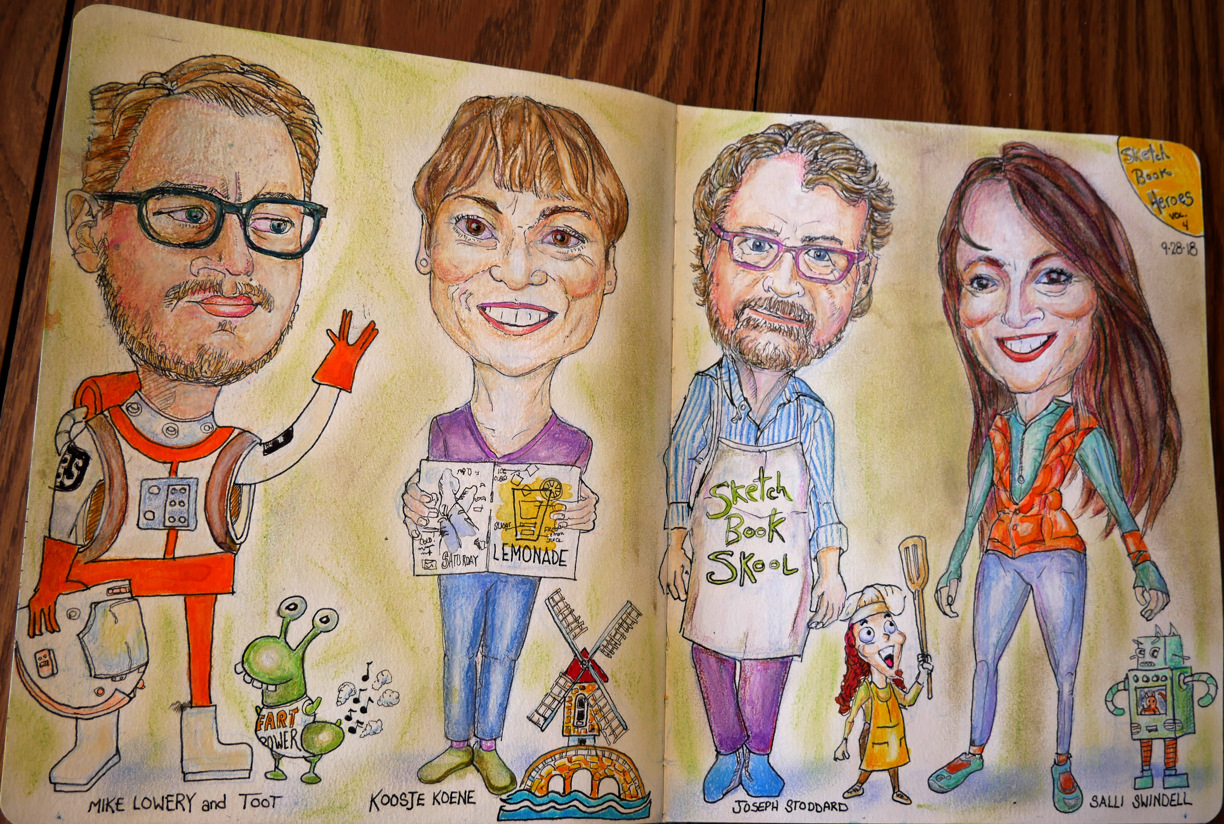 At Sketchbook Skool, I’ve attended classes in watercolor painting, illustration, urban sketching, mapmaking, and collage. The richest experience has been in meeting fellow students, first online, and later in person, and sharing our art with each other. I’ve made friends across the US and into Europe. My wife and I attended the first conference dedicated to sketchbook art-making in Pasadena, CA where 400 fellow students joined us. I drew caricatures of the instructors who taught at this conference and of its keynote speaker, Austin Kleon. (He is the guy in the bottom left image who is leaping into the air, fist raised.)