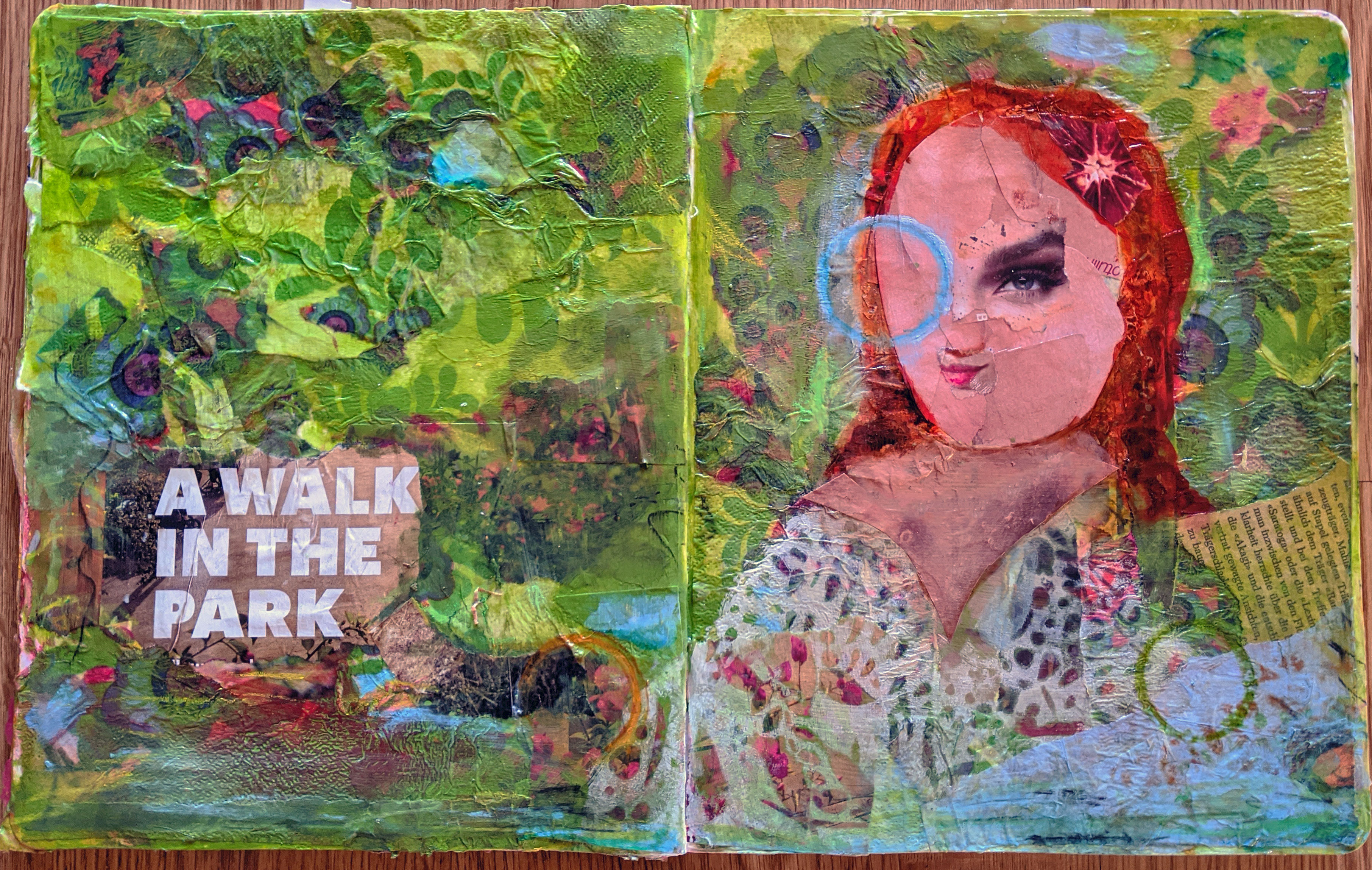Recently, I’ve taken up collage work in sketchbooks that can handle the demands of this craft, including this piece, constructed of napkins, paint, and art from Vincent Van Gogh.
