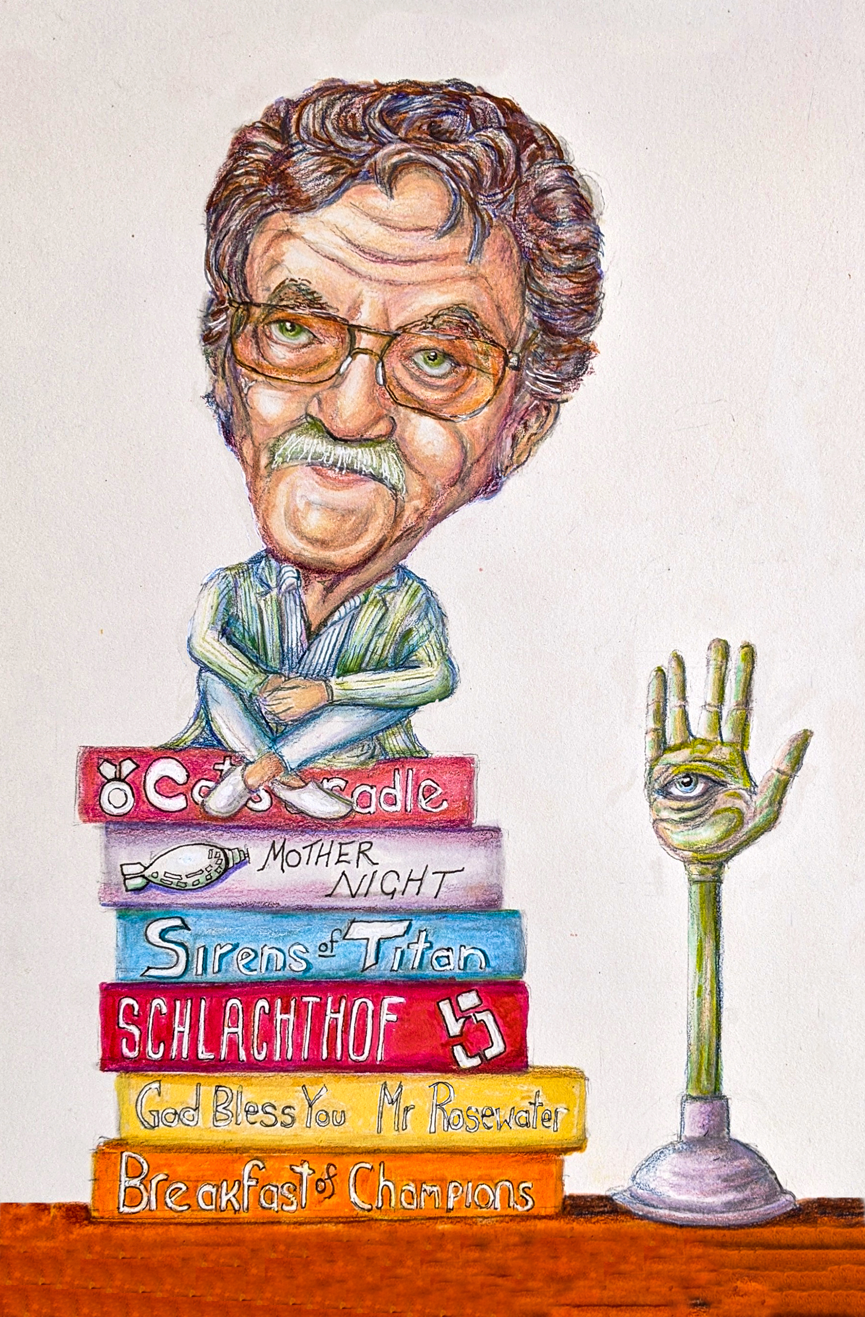 I’ve loved Vonnegut’s work since I read Slaughterhouse Five and many of his other books while in my 20s. I love him for his contradictions. He once said, “I urge you to please notice when you are happy, and exclaim or murmur or think at some point, ‘If this isn’t nice, I don’t know what is.” Later, he responded to a PBS host, who’d asked, “How’s life?,” by saying, “Well, it’s practically over, thank God.” He joked he was going to sue big tobacco, because despite the warnings on their packages, their product had not killed him. See the interview here. I admired him for his playfulness, his child-like drawings in his books, and for his advice to his writers.