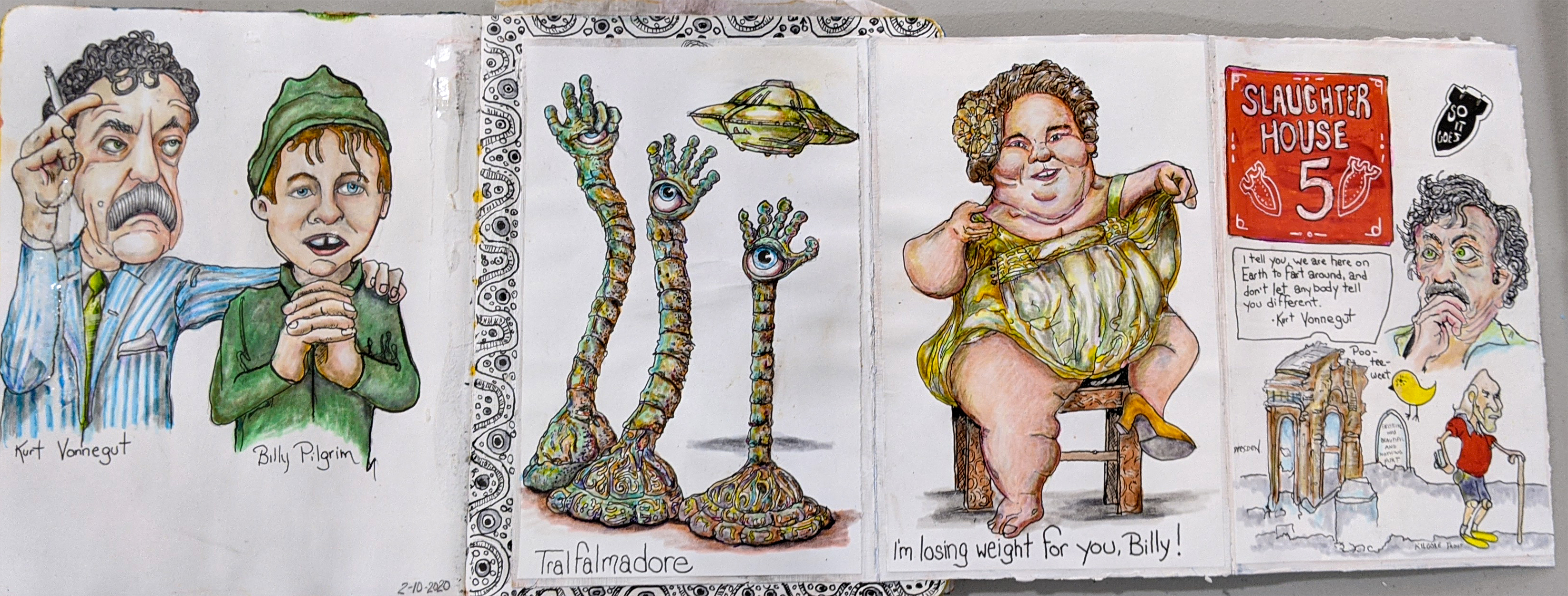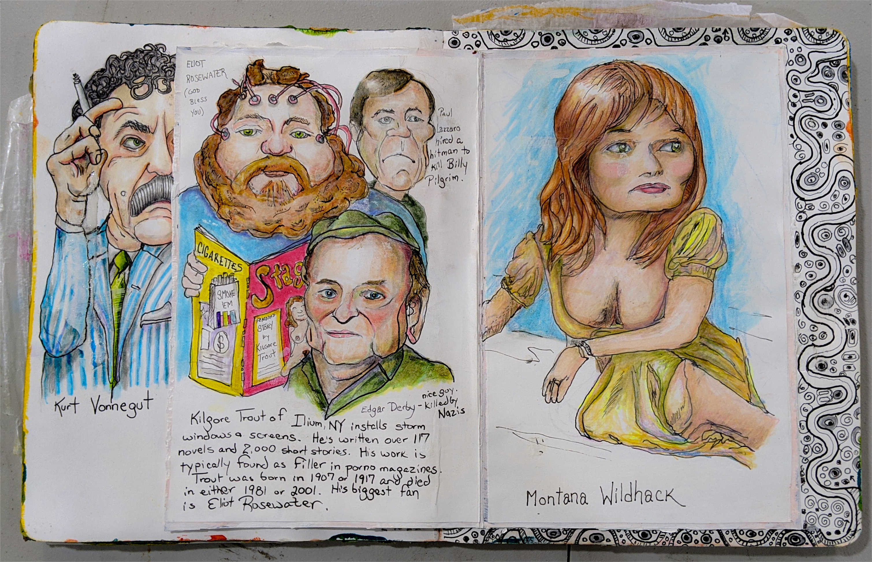 My sketchbooks pay homage to this Hoosier, the Tralfalmodorians, Kilgore Trout, and actress Valerie Perrine, who played the love-interest, Montana Wildhack, in the film version of Slaughterhouse Five.