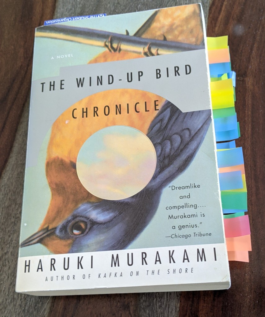 After completing Wind-Up Bird Chronicle, I devoured all but one of Murakami’s books. (I cannot get through Norwegian Wood, although I have tried multiple times.) My paperback copy of Wind-Up Bird Chronicle is decorated with colorful tags, each corresponding to a character or theme in the book. For example, a red tab directs me to passages about the character, Malto Kano, who wears a red vinyl hat that’s mismatched with the rest of her outfit and serves to help Toru Okada find his cat. Green tabs are for the character Maya Kasahara, a teenage girl with a droll delivery, wiser than her years, who gives the nickname, Mr. Wind-Up Bird, to Okada after he tells her of a bird he hears but never sees. It goes Creeak, as if winding the world’s spring.