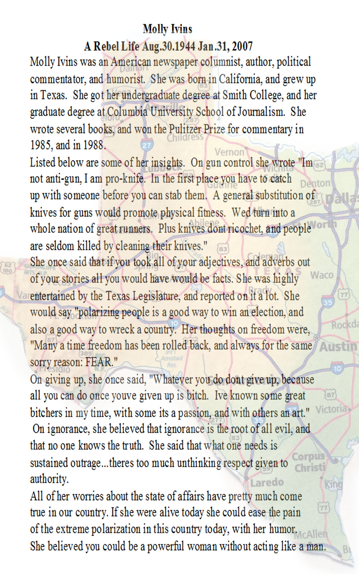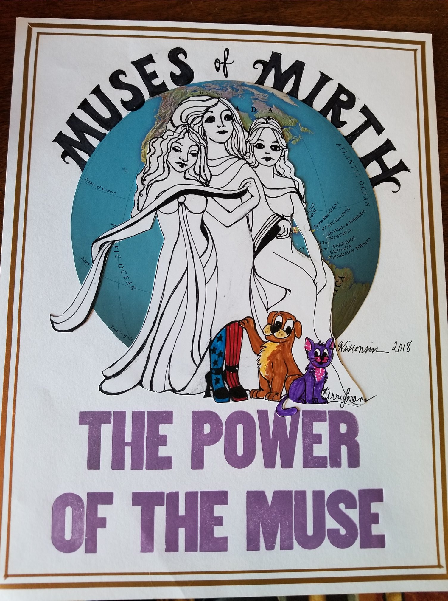 My thanks to Mary Nelson, Mary Mollerskov and Mary Nelson for helping me with this article and to other members of the Muses for the photos. Last year, Terry and I worked together on a limited edition zine about the Muses of Mirth, featuring their artwork, along with tributes to the late journalist Molly Ivins. She would have loved the Muses, I’m sure.