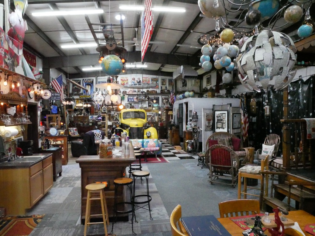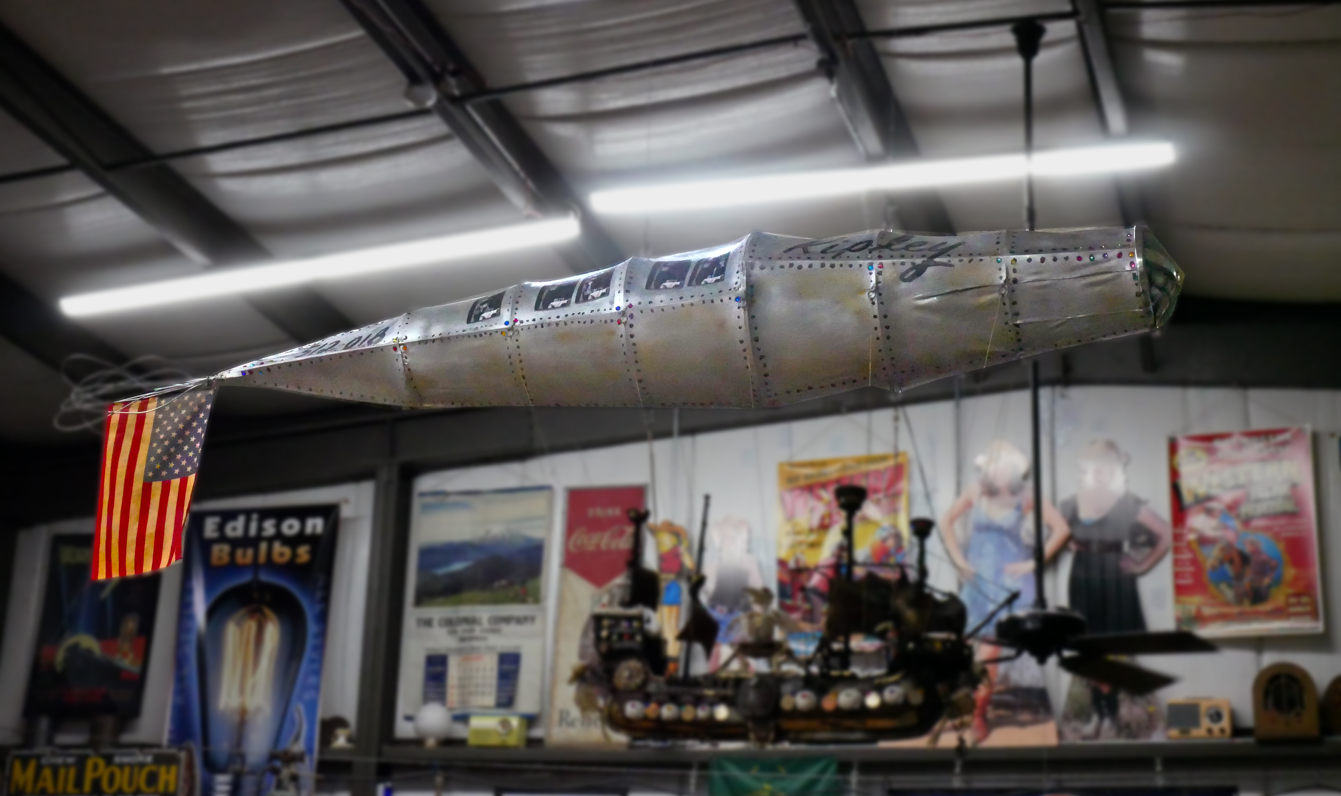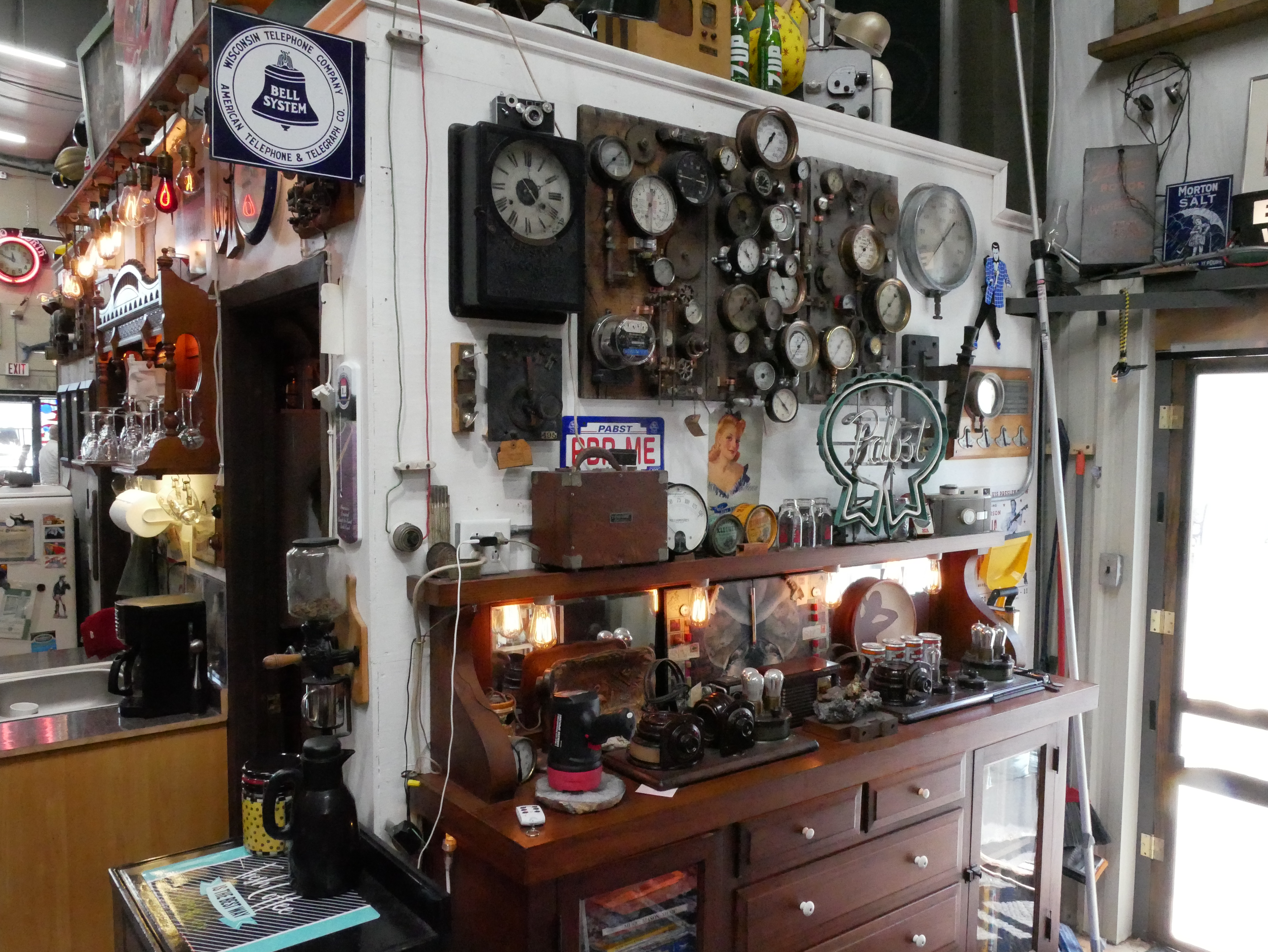 In pre-Covid days, Terry welcomed Muses’ members to her home, a Racine , WI warehouse transformed into wonderland, filled from floor to high ceiling with vintage dolls, roadside metal signs, antique cabinetry, clocks, art made by local artists, globes, a dirigible bearing the name of the family’s long haired chihuahua, Ripley, and a custom-made fifth-wheel wooden trailer with stained glass windows, dubbed the Wayzless. It’s a grand museum, considering the word, museum, in its original context, defines a shrine for the Greek Muses.