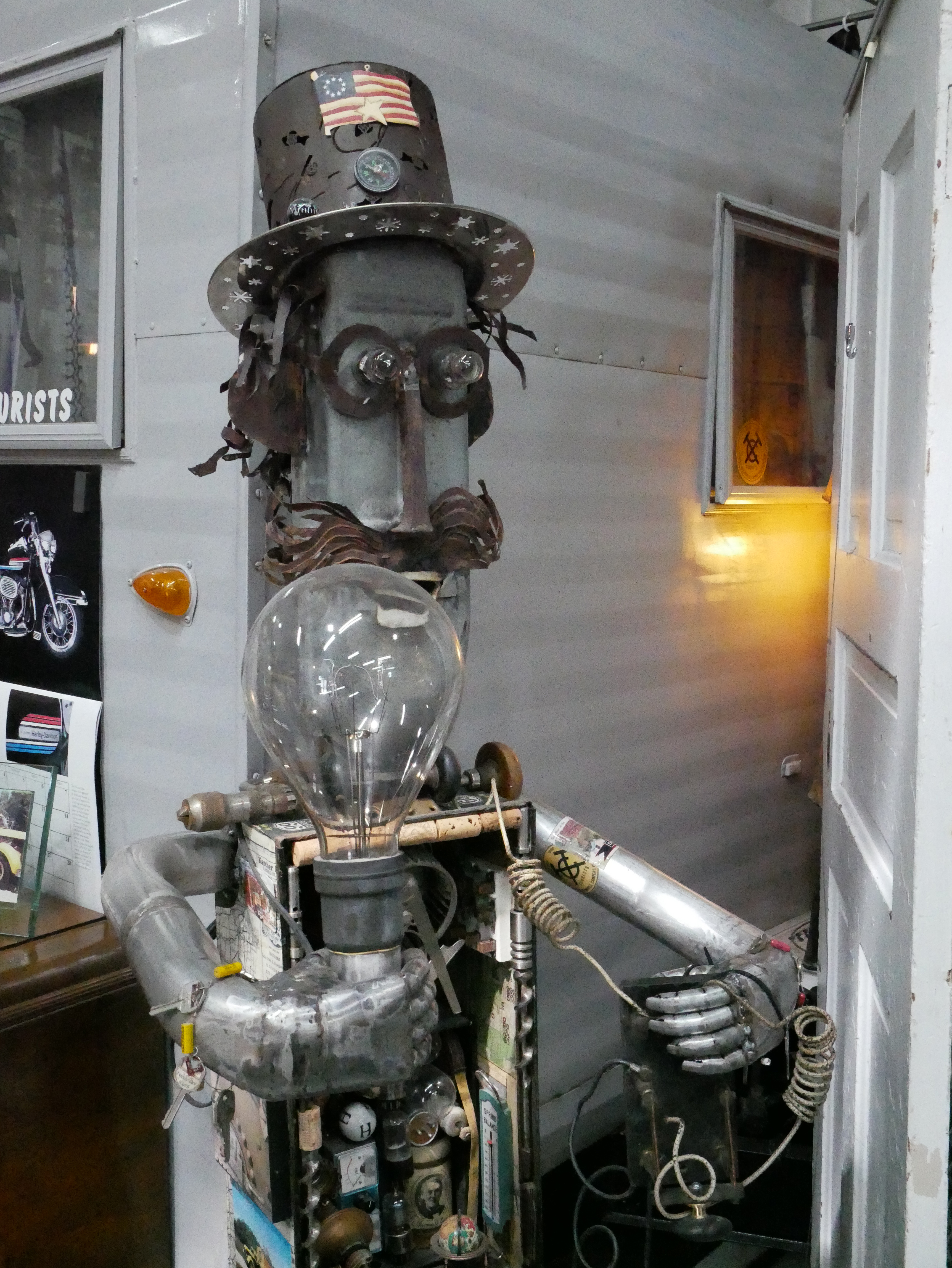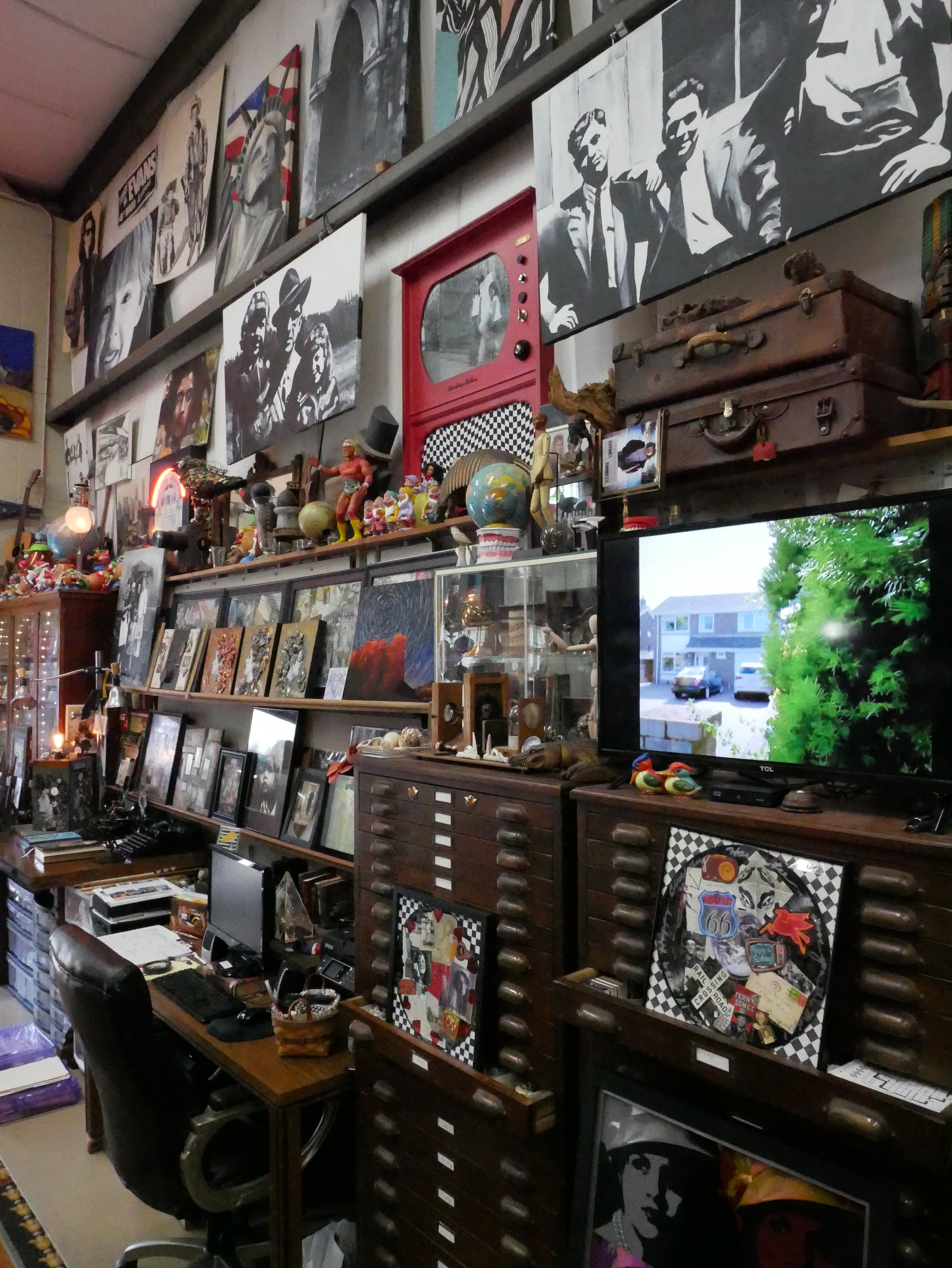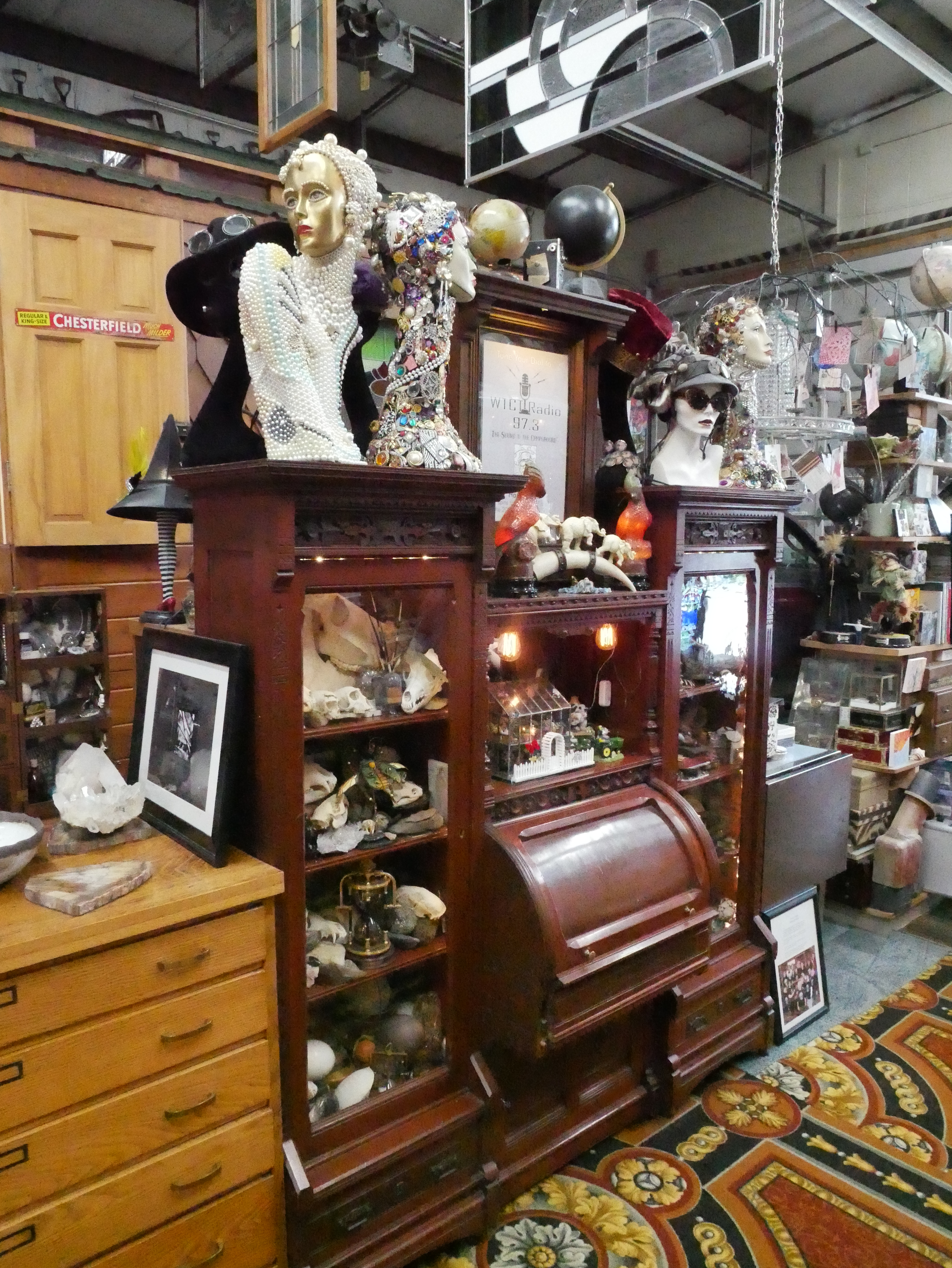 In pre-Covid days, Terry welcomed Muses’ members to her home, a Racine , WI warehouse transformed into wonderland, filled from floor to high ceiling with vintage dolls, roadside metal signs, antique cabinetry, clocks, art made by local artists, globes, a dirigible bearing the name of the family’s long haired chihuahua, Ripley, and a custom-made fifth-wheel wooden trailer with stained glass windows, dubbed the Wayzless. It’s a grand museum, considering the word, museum, in its original context, defines a shrine for the Greek Muses.