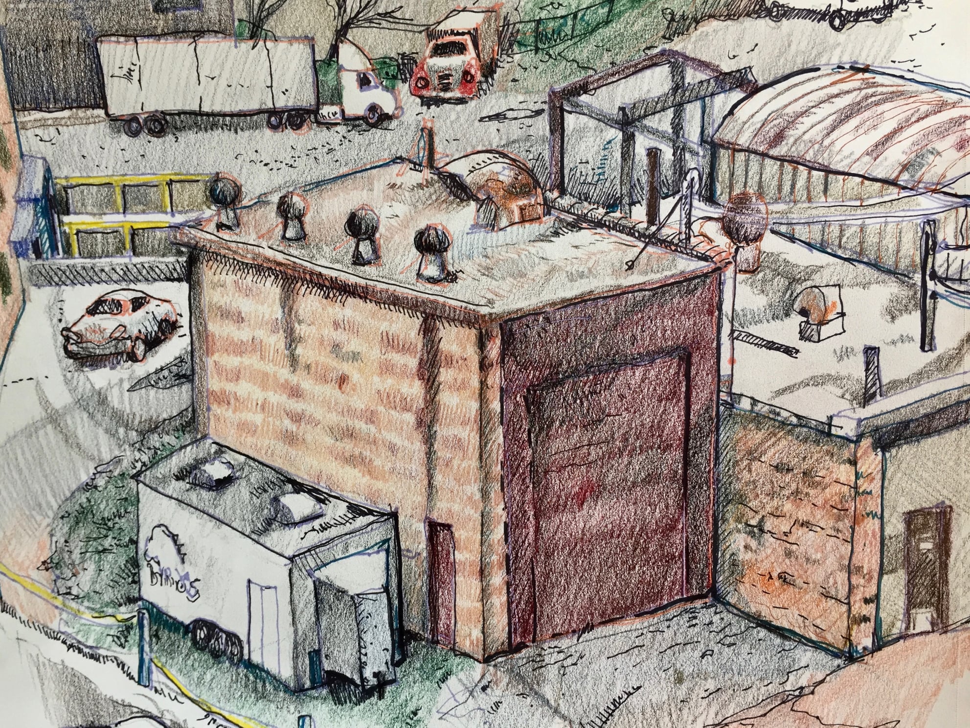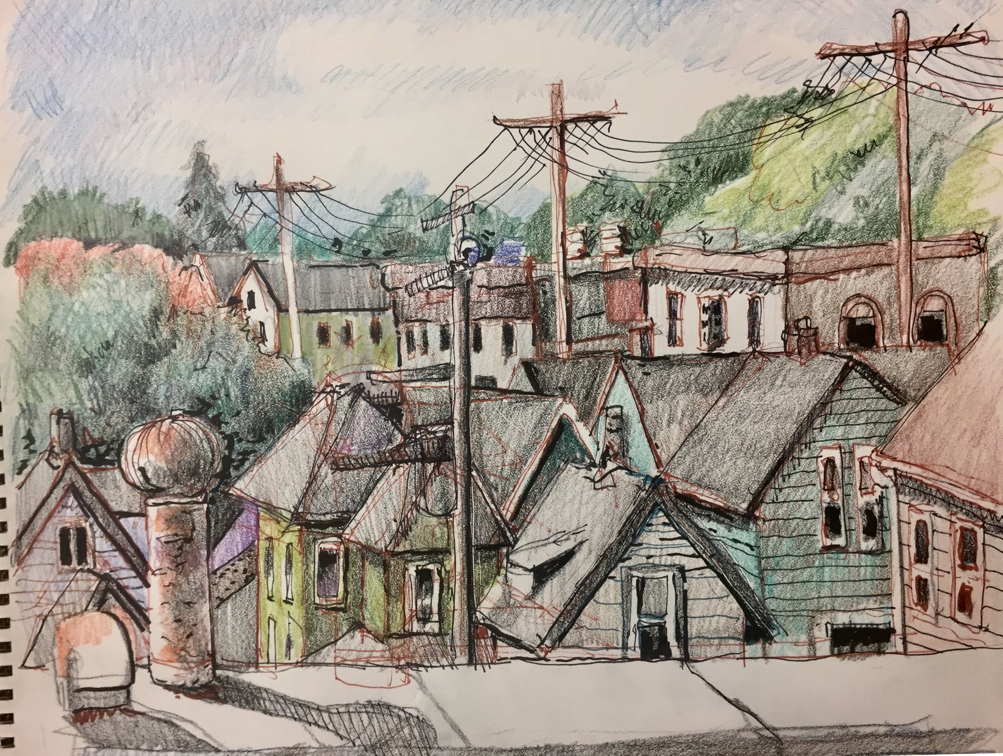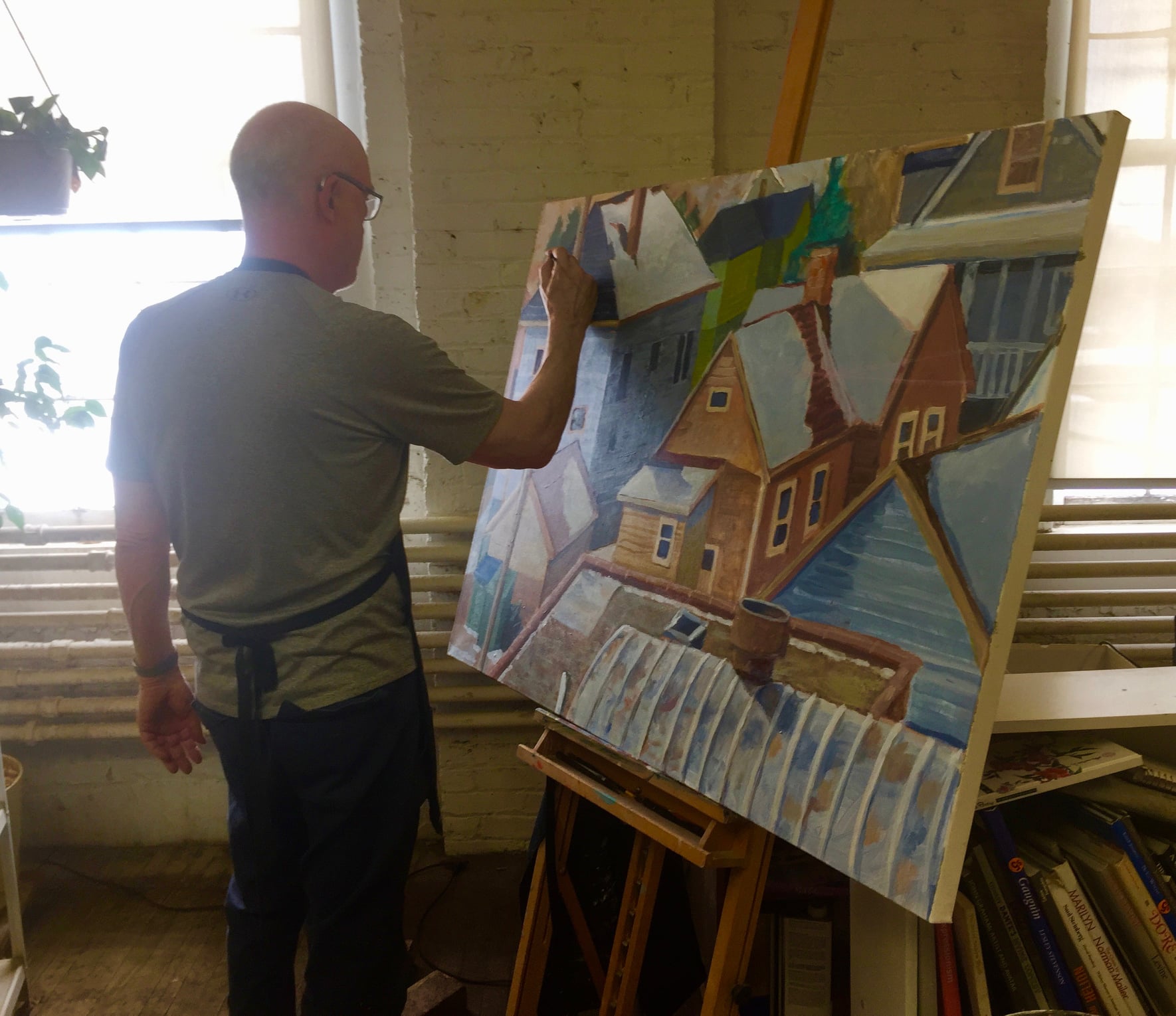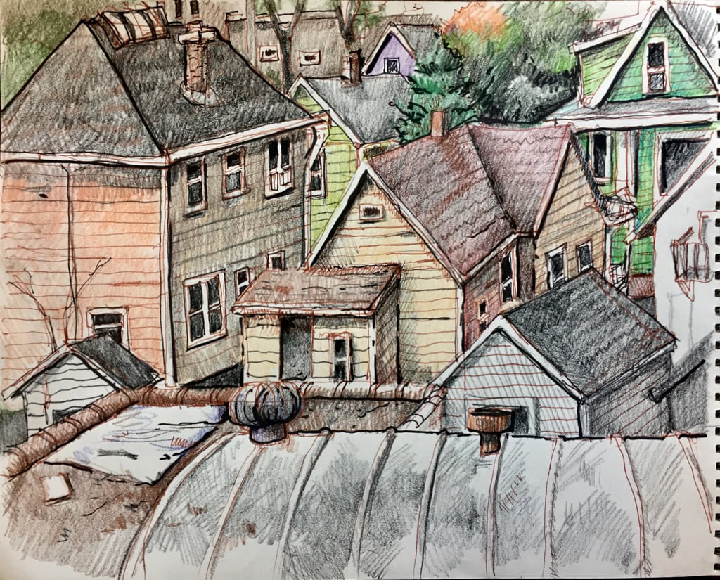 Jerry’s latest project is a series of drawings and paintings, rendering the urban landscape as seen from his fourth-floor window. “I have really felt the need to draw some real stuff lately,” he says. He admits to challenges in capturing images on canvas and paper, as weather conditions and the light are in flux from hour-to-hour and day-to-day.