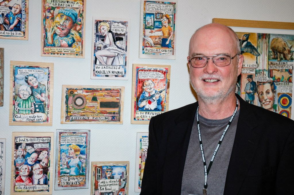 I prefer mornings for spending time in our studio. It’s quieter then, allowing me time to sulk, listen to podcasts or music, write these articles, and put pen to paper or brush to board or canvas. I’ve been creating illustrations for a short-story, penned by Kenosha writer Jodi Diderrich, and engaging in portrait paintings, inspired by Deb Weiers, George Condo, Lyonel Feininger and Charles Bragg. I also take inspiration from fellow 16th Street artists Jerry Belland and Diane Levesque. I love art that makes me grin and their work brings a lot of joy to my soul.