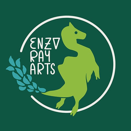 In addition to working in his studio, Enzo operates his EnzoRayArts Etsy store, where you can pick up his enamel pin creations of dinosaurs, Bigfoot, a cat-shaped octopus, Queer Pride buttons, and EnzoRayArt holographic stickers.