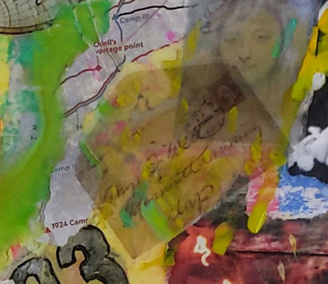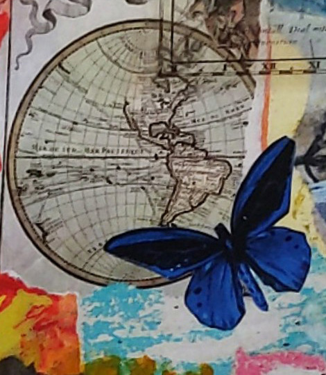 I’m still decoding the story contained in the final piece, examining the images of maps, tickets, butterflies, the number 93, and a photo of woman with a flower in her hair. I’d begun this piece, using instructions by artist/author Nick Bantock for a collaborative collage. Bantock encourages participants to work quickly, not thinking about what they’re doing. I covered half a sheet of watercolor paper with a wash of acrylic paint and used a colored pencil to scribble lines over the other half. I added chalk pastel, a photo from a copy of National Geographic, as well as a small section of a road atlas.