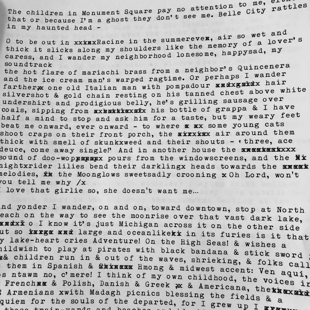 And yonder I wander, on and on, toward downtown, stop at North Beach to see the moonrise over that vast dark lake, o I know it’s only Michigan cross’t on the other side but so large and oceanlike in its furies is it that my lake-heart cries Adventure! On the High Seas! and thumps a childwish to play at pirates with black bandana and sticksword. And children run in and out of the waves, shrieking, their folks call to them in Spanish and Hmong and midwest accent: “Ven aquí, Los ntawm no, C’mere!” I think of my own childhood, the voices in French and Polish, Danish and Greek, Americana, and the Armenians with Madagh picnics blessing the fields and singing a requiem for departed souls, for I grew up in those trainyards and beaches and blackberry brambled backyards and beat old playgrounds of Highway 32 and the Root River. I was surrounded by other kids with no escape, under the bridge, among the rusted bicycles, along the brick-streeted neighborhoods and sleepy porches of early evening where girls played guitars while their older brothers were at work in the factories building tractors and transmission equipment.
