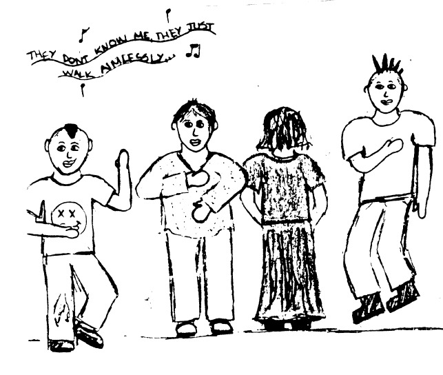 The music: sloppy musicianship, garage band level recording quality, nothing earth-shattering in terms of sound or lyrics. It wasn’t good. It was perfect. An album equal parts angst and joyful crassness. Songs about killing gophers, overdosing on toluene, bathroom sex. I’m a wuss, kill me! Songs about rejecting patriotism, throwing off the blankets of history. And our favorite—“They Don’t Know Me,” an alienated anthem we stomped to during those first stirrings of our teenage rebellions; complete with a horn section (though it wasn’t ska) and backing vocals by ‘the Oi! Choir.’