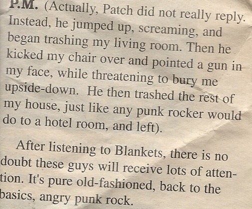 Actually, Patch did not really reply. Instead, he jumped up, screaming, and began trashing my living room. Then he kicked my chair over and pointed a gun in my face, while threatening to bury me upside-down. He then trashed the rest of my house, just like any punk rocker would do to a hotel room, and left.
