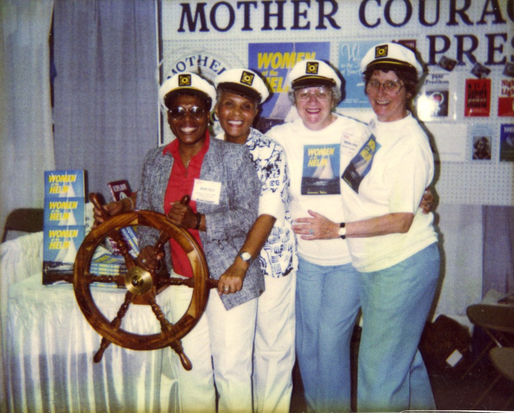 The word when out at the ABA that small press lesbian publishers were going to organize. We crowded into Nancy Bereano’s hotel room. She’s Firebrand Press. The others were Barbara Grier and Donna McBride of Naiad and women from Calyx, Cleis, Kitchen Table Women of Color and Seal presses, plus Onlywoman Press from London. I think they’re all lesbians. We became a loosely organized bunch to give us more clout. Someone named us Book Babes. And Mother Courage was there at its beginnings.