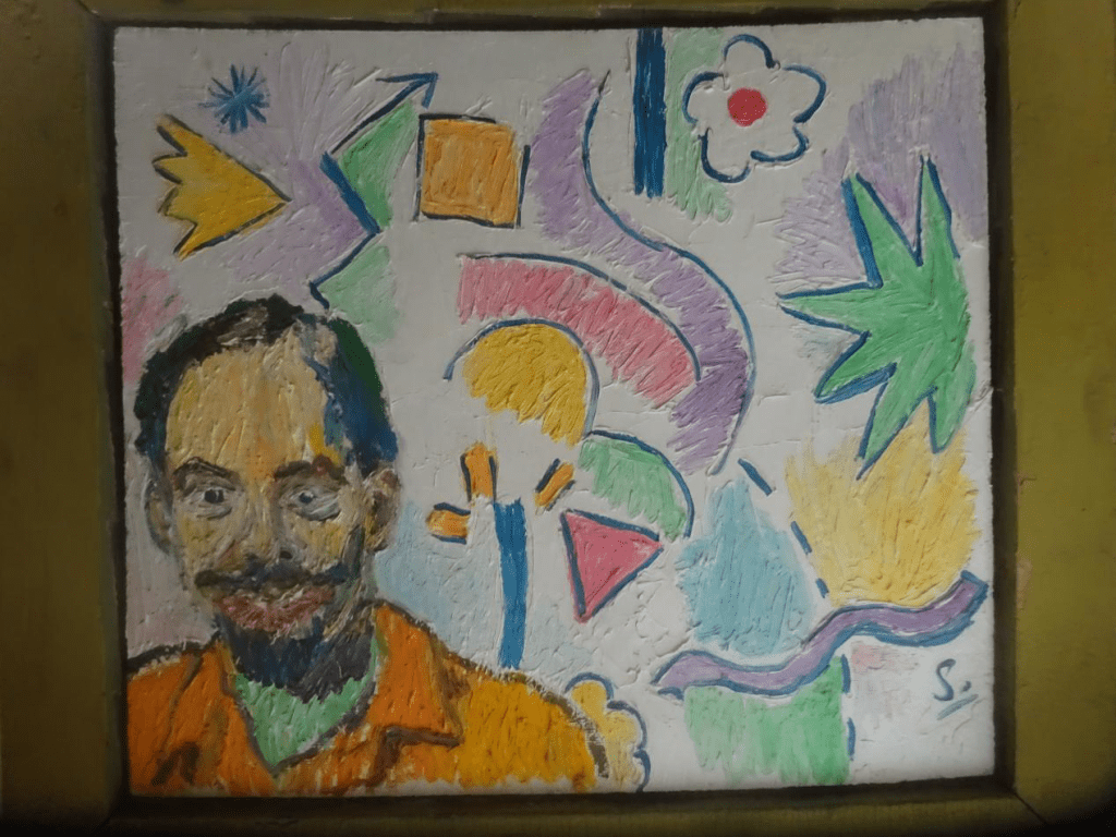 Phil self-describes his paintings as “American Academic Abstract Primitive Mannerist” (he also sculpts, calling his work “Figurative Surrealism”) and here is a portrait he did of me, ca. 1990, where the background is in his self-described manner: