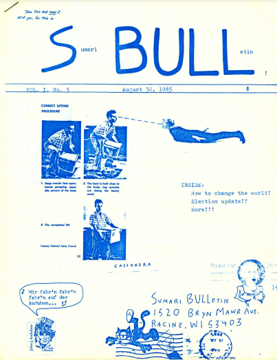 I actually don’t greatly identify with the word “writer” and maybe why will become quite obvious, but in 1985 (in the photocopier era as opposed to the desktop computer era), at the suggestion of a pen pal friend, I started a zine. He suggested I call it Sumari Bulletin. I named it Sumari BULLetin, alternately S.BULL.