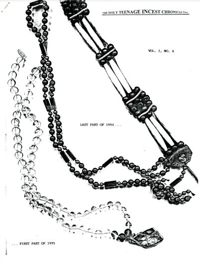 The word “incest” was a deliberate choice to be controversial, but, I assure you, was not practiced! (Or maybe I should speak only for myself — I can’t be responsible for any actions that took place behind my back!) It was a zine, again of my friends and I, therefore, a figurative incest, “incestuous” as in “not good because of always involving the same group of people“; you know, kind of like corporate boards whose members also sit on other corporate boards like one big, happy, rich family.